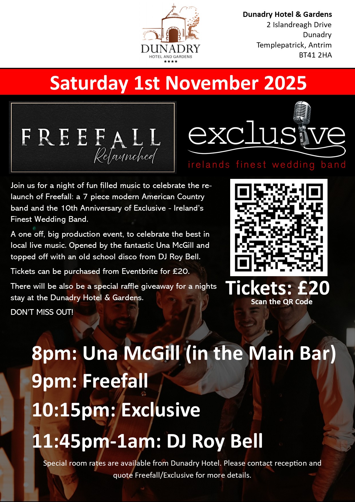 1st October 2025: Hi Guys! 2025 is the 10th year of Exclusive! To celebrate, we are throwing a party night in the Dunadry Hotel & Gardens in Templepatrick, just outside Antrim on Saturday 1st November! Tickets are £20 and can be purchased from Eventbrite, just click on the link below or scan the QR code to take you to the website.